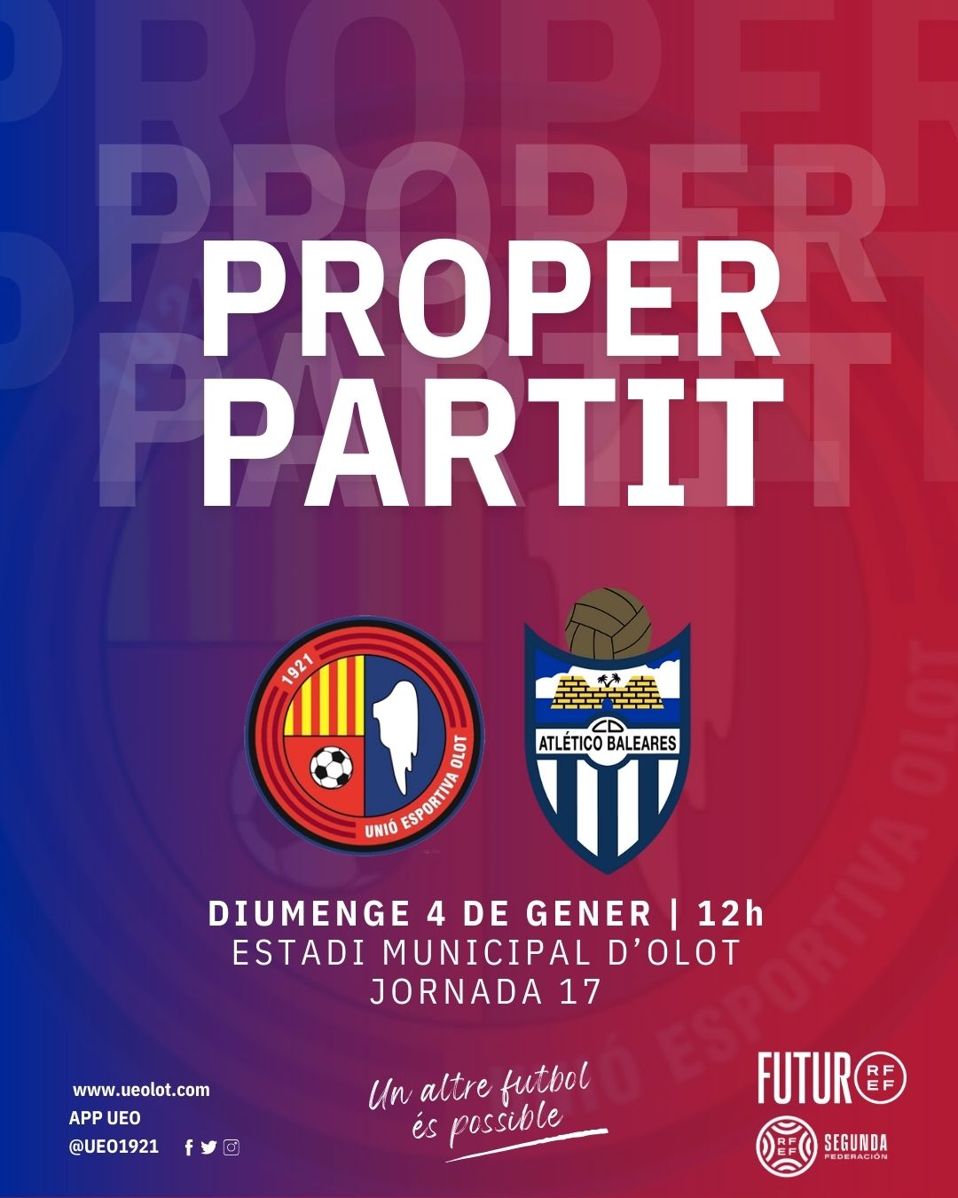 El partit, corresponent a la jornada 17 del campionat de lliga del grup tercer de Segona Federació, es disputarà aquest diumenge a partir de les 12 del migdia a l’Estadi Municipal d’Olot i en directe a Ràdio Olot. Hi haurà un minut de silenci per a Paco Quicios, ex-àrbitre de la comarca i soci del club, i el Xou del Xut serà per a socis UEO de totes les edats. A més, sorteig d’un àpat per a dues persones al B-Crek Solfa per a tothom qui vingui amb la samarreta de l’Olot. No hi falteu per començar l’any amb bon peu!