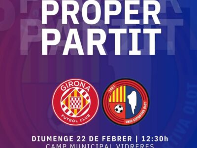 La Unió Esportiva Olot, en plena dinàmica positiva, visita aquest diumenge (12.30h, La Xarxa+) el Municipal de Vidreres en el derbi gironí de Segona Federació. El filial del Girona, que només ha perdut un partit com a local i va ser a Montilivi, té els mateixos punts que els olotins a la classificació. Pau Salvans, que compleix cicle de targetes, és baixa per als de Roger Vidal, que recupera Robert Costa i espera la resposta de l'afició en la sortida més propera de la lliga.